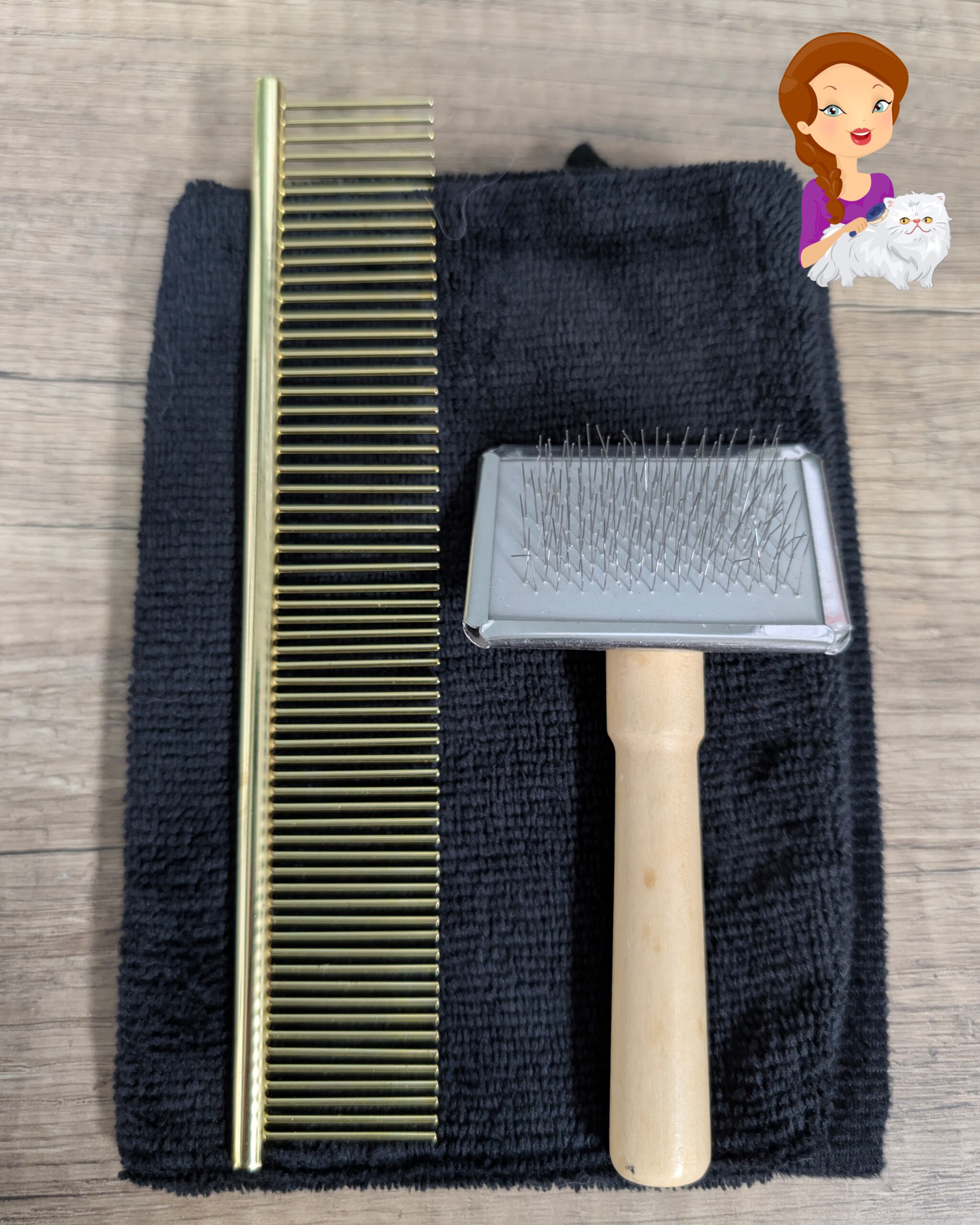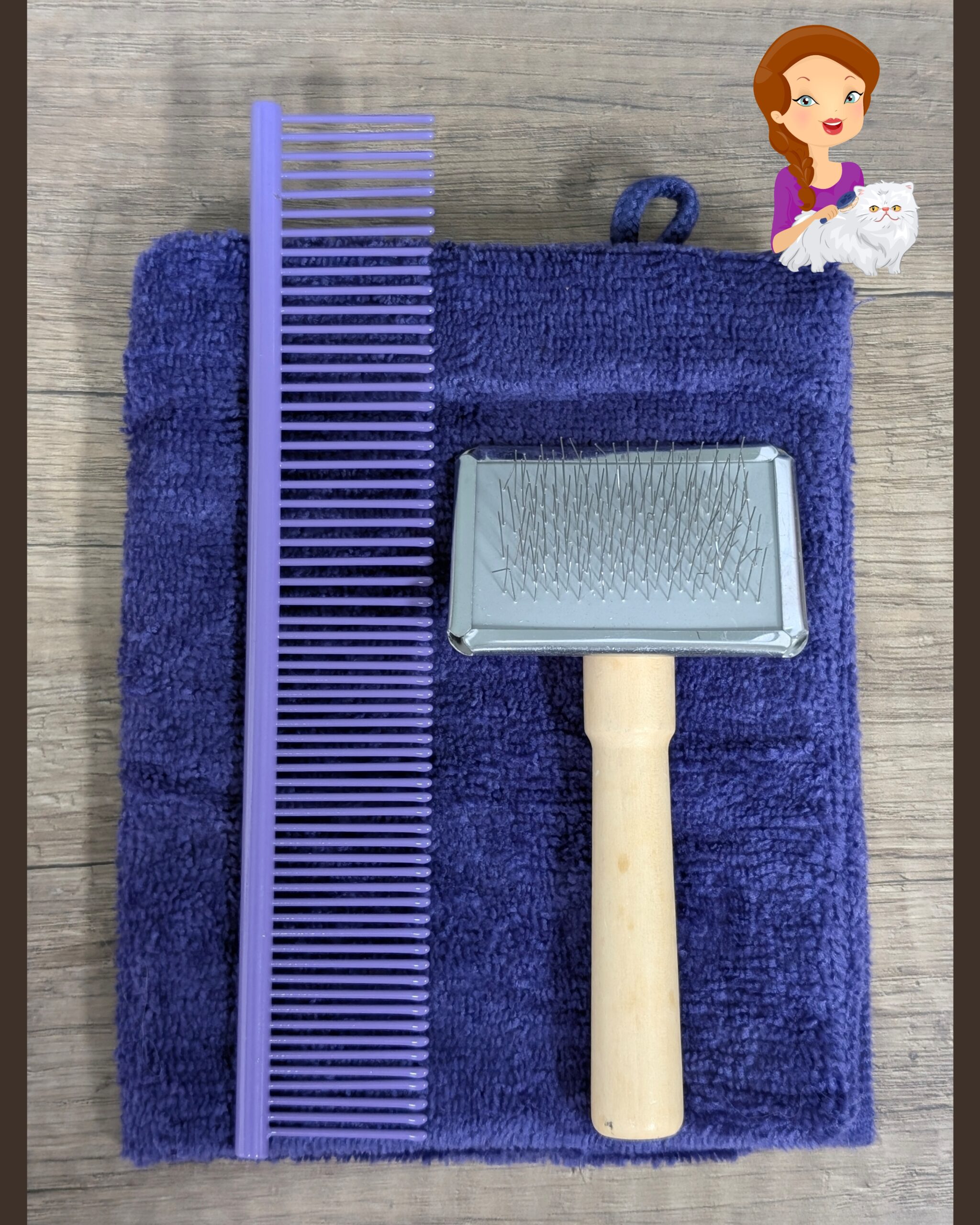 De basis vachtverzorging set bestaat uit een rvs combi kam, slicker-borstel en microvezel-handje.