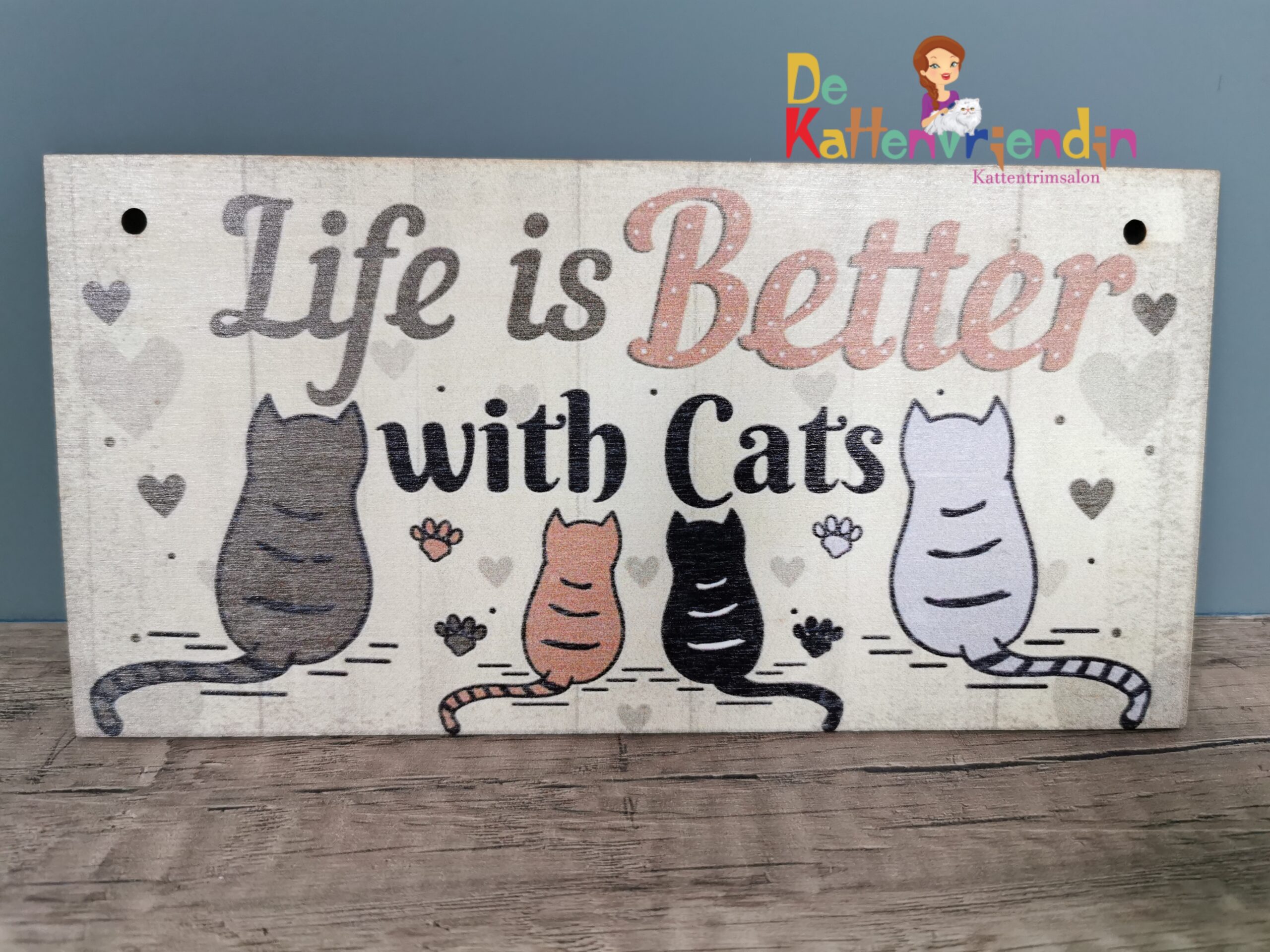 Leuk tekstbordje met de tekst ” Life is better with cats”